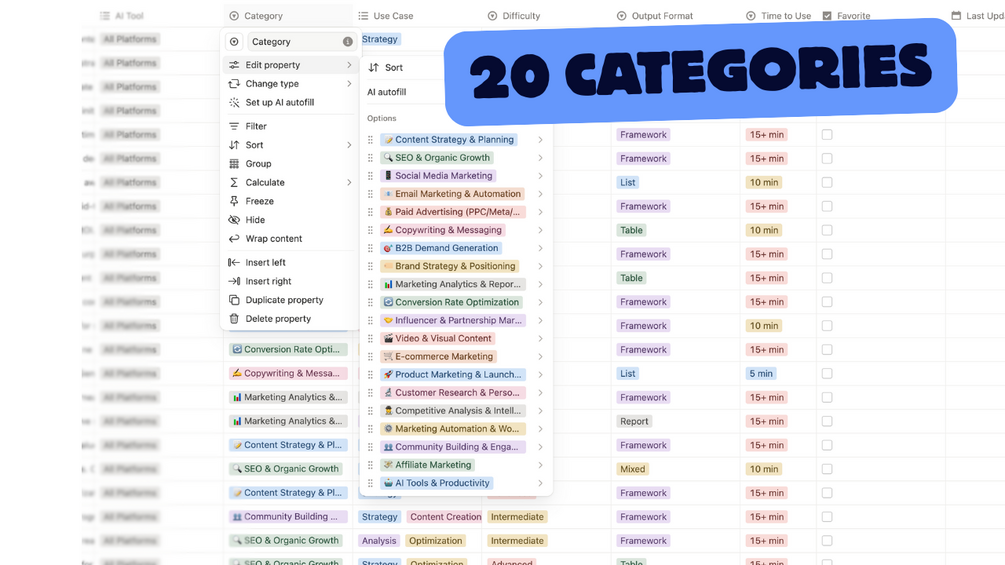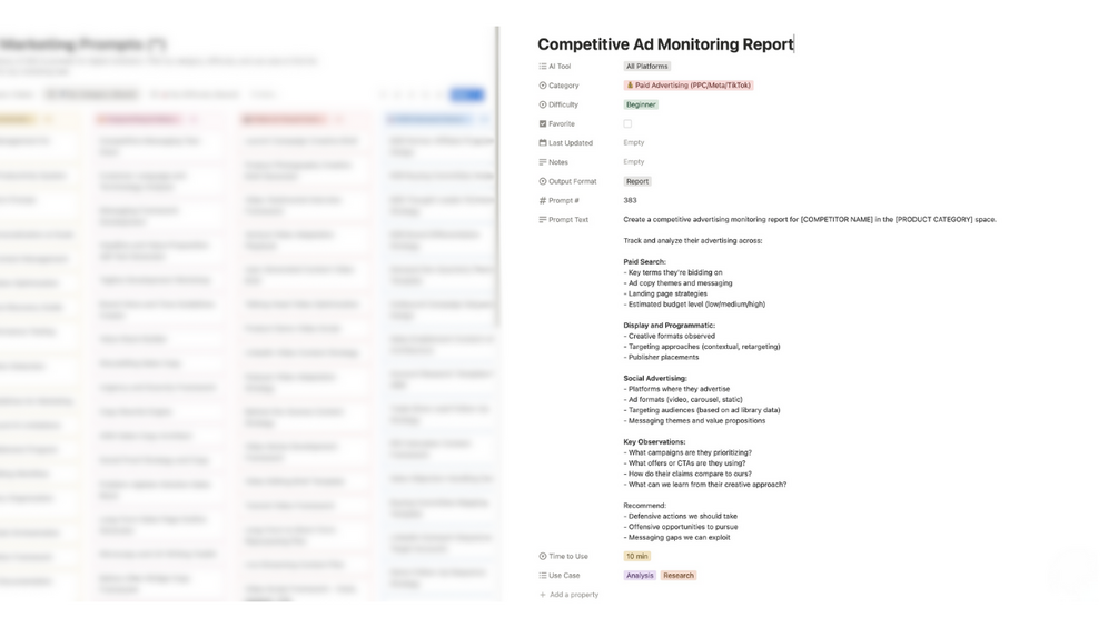 Q: Will this become outdated as AI improves? These prompts are built on timeless marketing principles, not platform quirks. Plus, you get lifetime updates — I add new prompts regularly and you get them automatically in the Notion database.